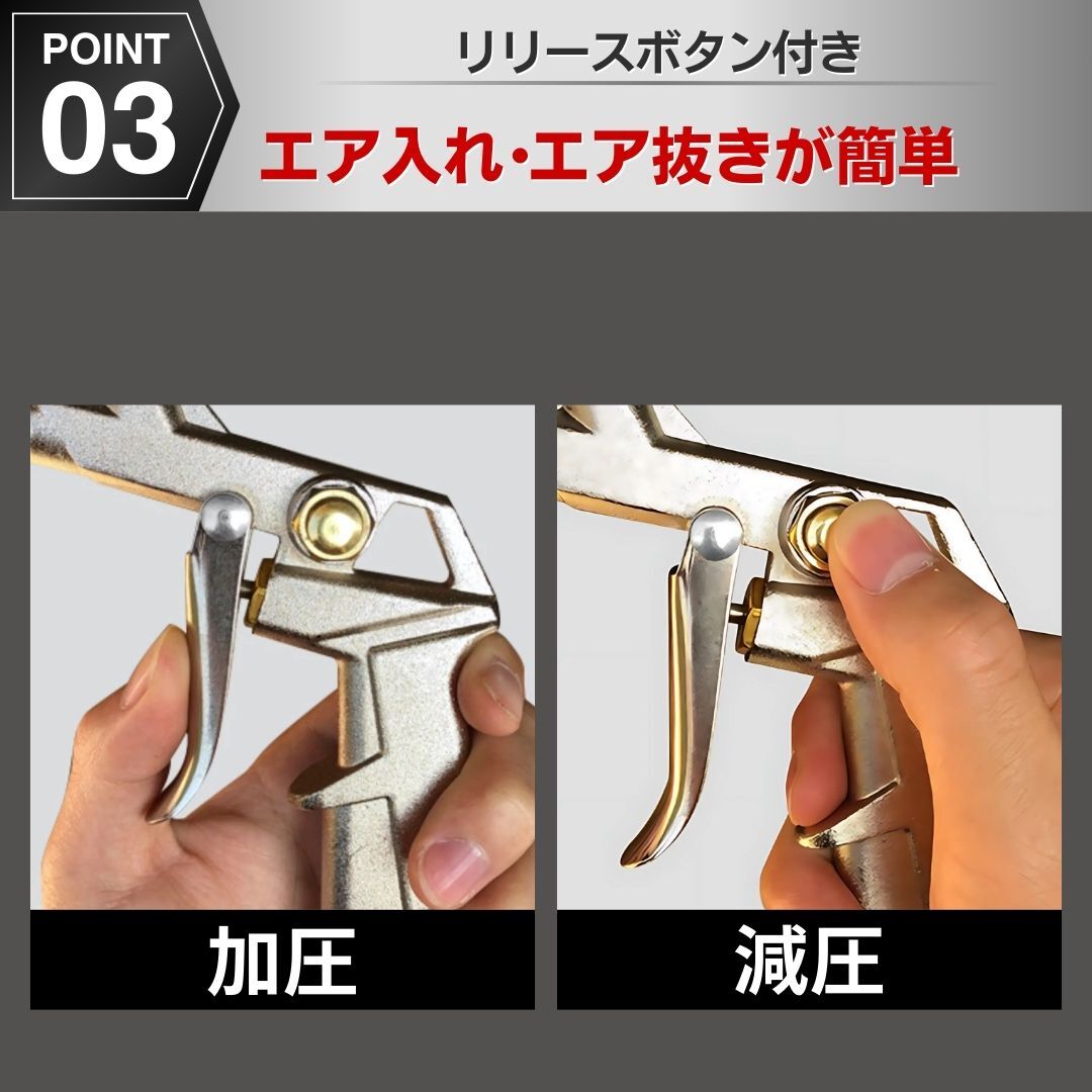 空気圧チェック・エアー充填・減圧 チャックをバルブに押し当てると空気圧チェック。レバーを引くとコンプレッサーからエアー充填。空気抜きレバーを押して、エアーを減圧する事が出来ます。