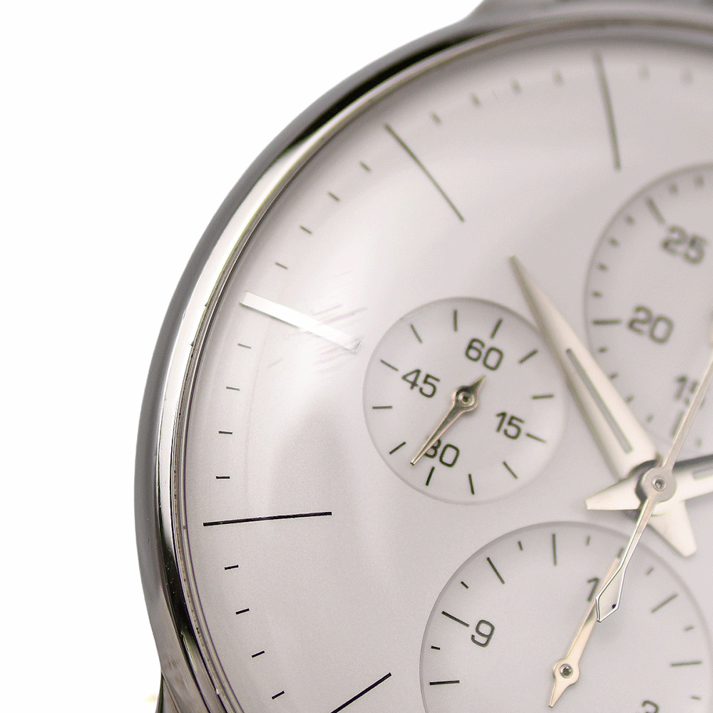 ユンハンスのクロノグラフモデルが入荷しました。9連ブレス使用となっておりますので、着け心地もなめらかです。ドイツ時計は、シンプルながらも細かい遊び心があり、大人でおしゃれな方に人気です。