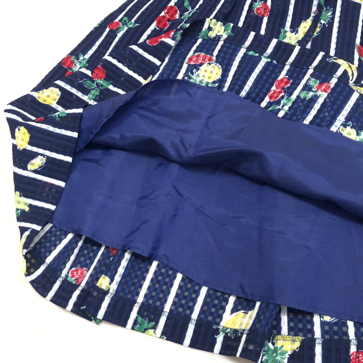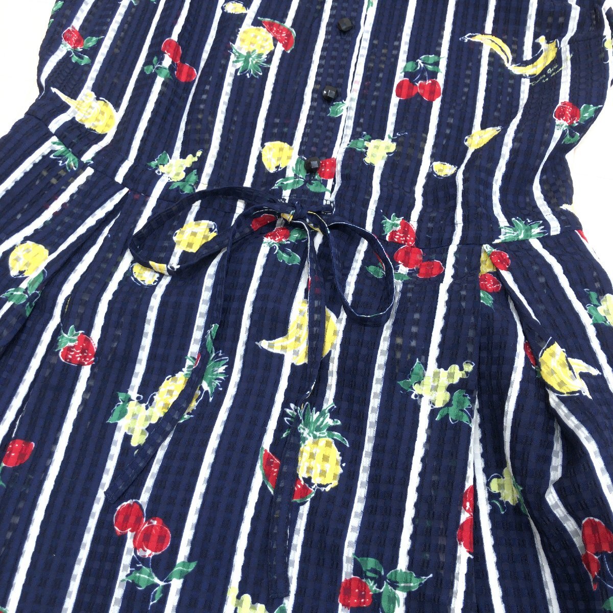 美品 DOLLY GIRL BY ANNA SUI アナスイ レイヤード 総柄 ギャザー シアードレス ワンピース 2(M) 濃紺 ネイビー フルーツ柄 半袖 ミディ丈