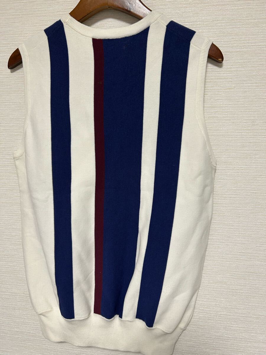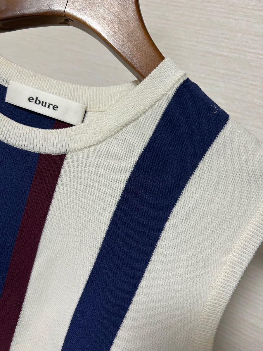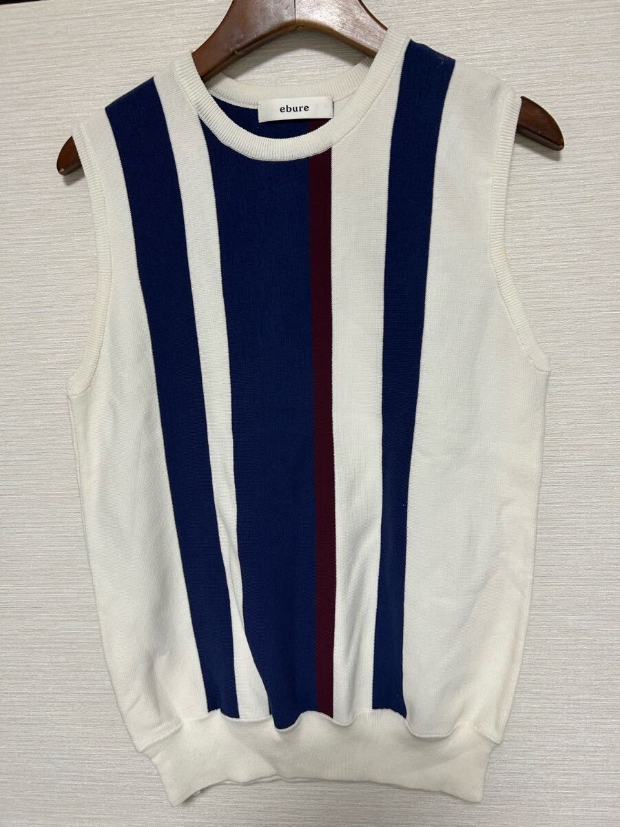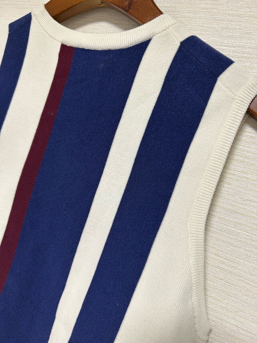 ストライプデザインのノースリーブセーター、ホワイトとネイビーのコントラストが特徴。