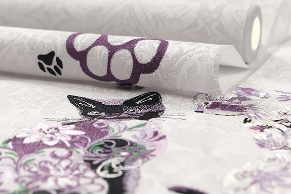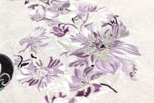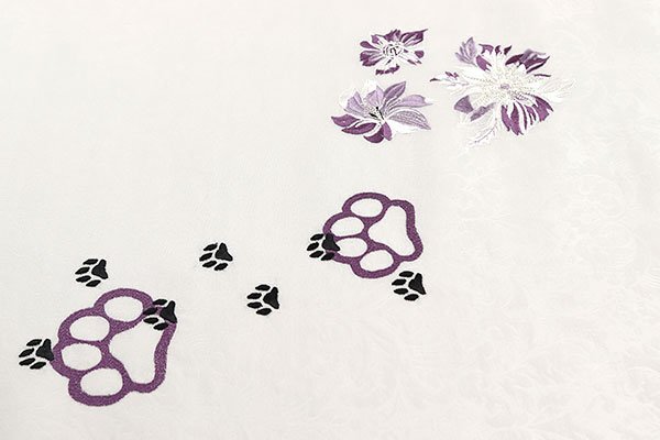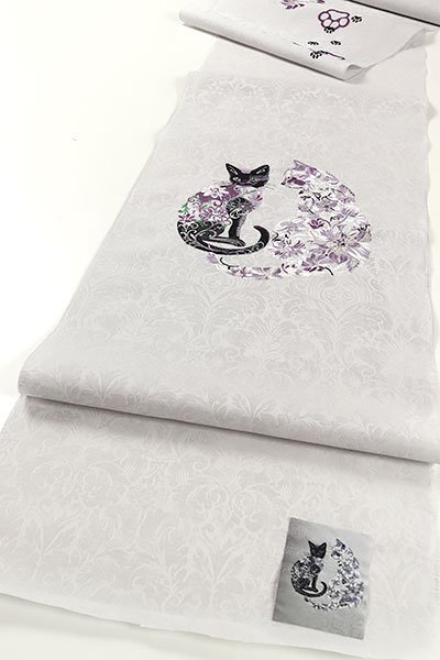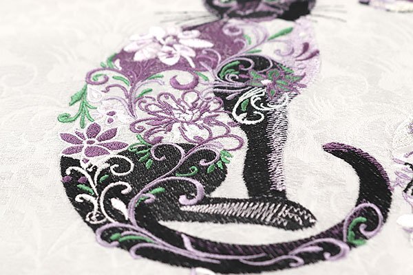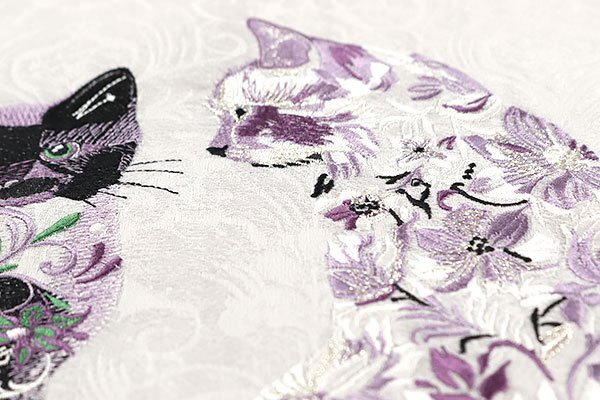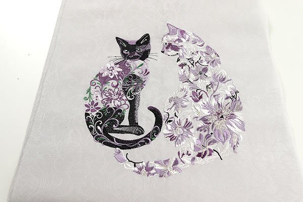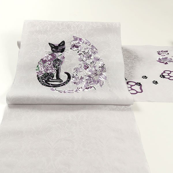 お太鼓や胴部分には、黒色、紫色、白藤色、白色、緑色、銀糸などのお色目で、ボヘミアンな雰囲気の猫や猫の足跡が刺繍されております。