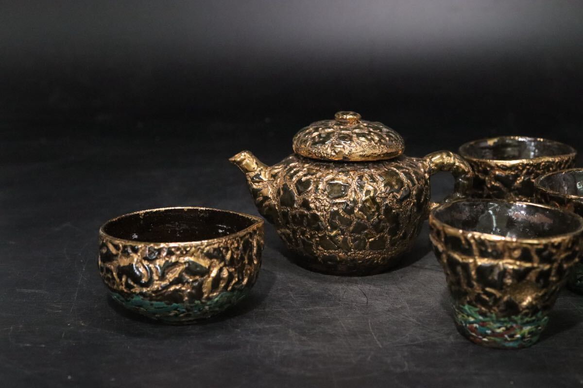 希少 金塗 金彩 ・ 彩色 煎茶器 揃 急須 湯冷まし 煎茶碗 セット / 茶器 検索: 屋島焼 楽焼 楽山焼 二六焼 .B822