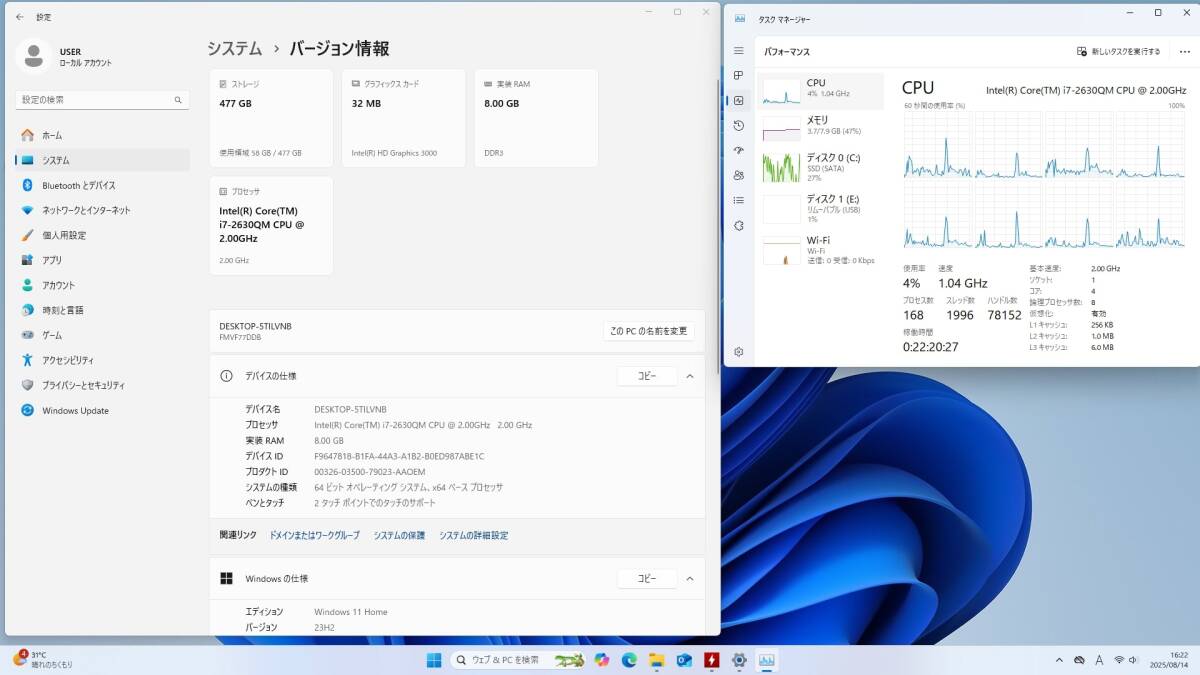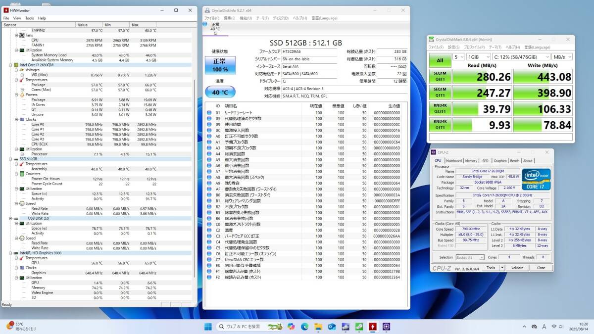 CPU:Corei7-2630QM  Mem:PC3-10700 8GB SSD:Goldenfir 512GB(新品)