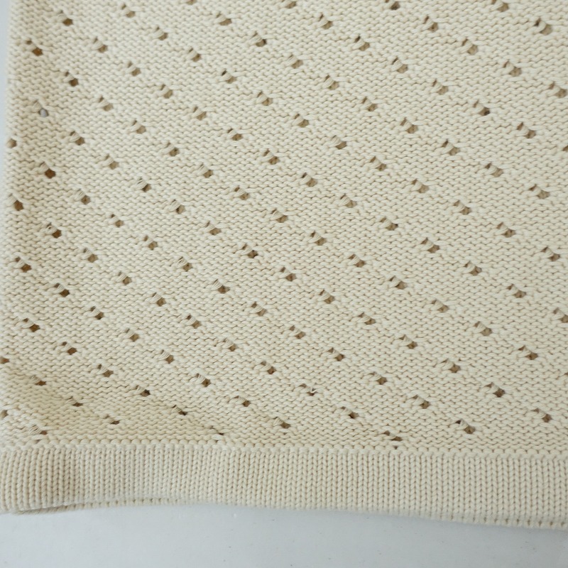 Pal’las Palace itoの透かし編みコットンニットプルオーバーです。カラーはライトベージュで、透かし編みが施された綿ニット地です。プルオーバータイプで着脱でき、襟ぐりは片方がリブ編みで、もう片方はロール仕様です。
