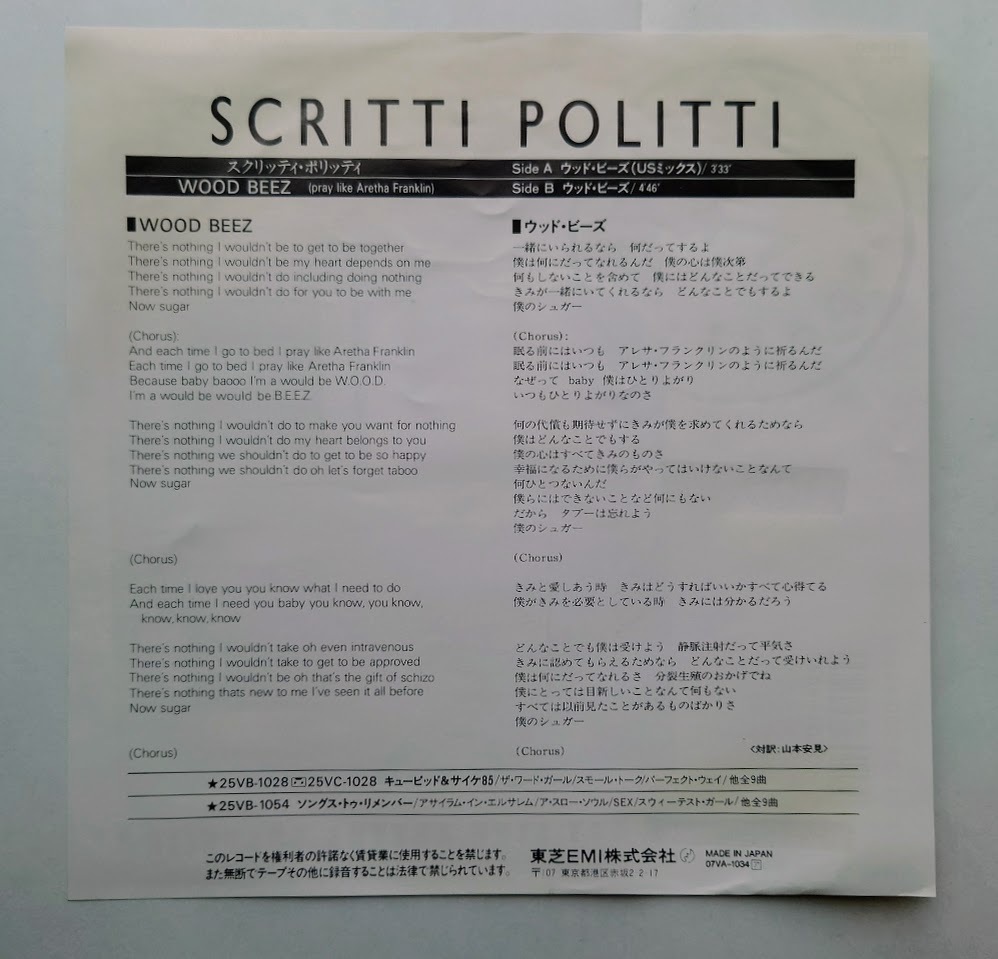 Product name: 中古7inch analog スクリッティ・ポリッティ / ウッド・ビーズ 07VA-1034 scritti politti wood beez