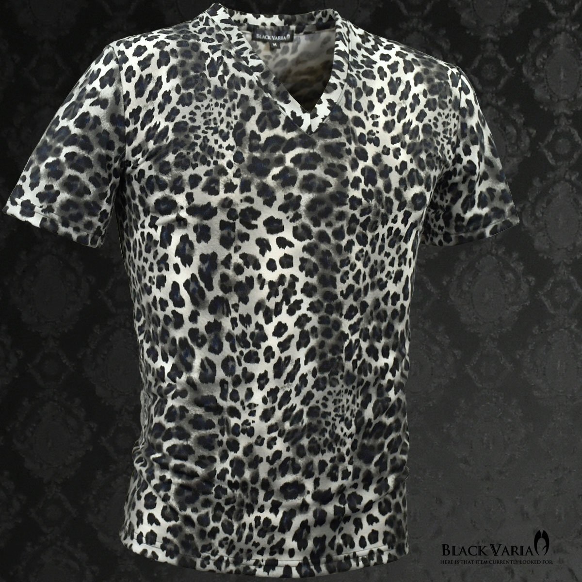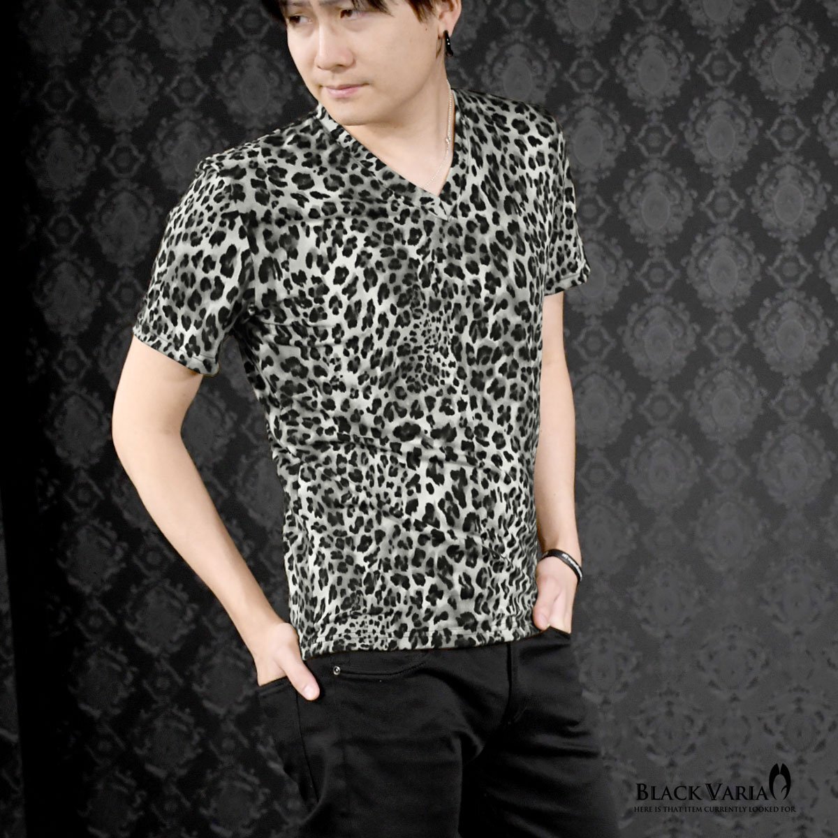 193802-gy ブラックバリア ヒョウ 豹 Vネック レオパード 日本製 スリム 半袖Tシャツ メンズ(ブラック黒グレー) 3L 総柄 アニマル 総柄