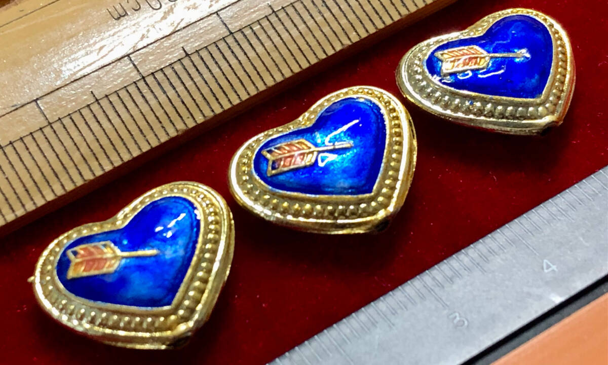 ¶!¶ 有線七宝焼ワールド - 3個のハート型ペンダント ¶!¶ 約厚6㎜×横18㎜×縦15㎜ 金線に藍色釉橙色愛の矢 手作 手芸 工芸 インテリア