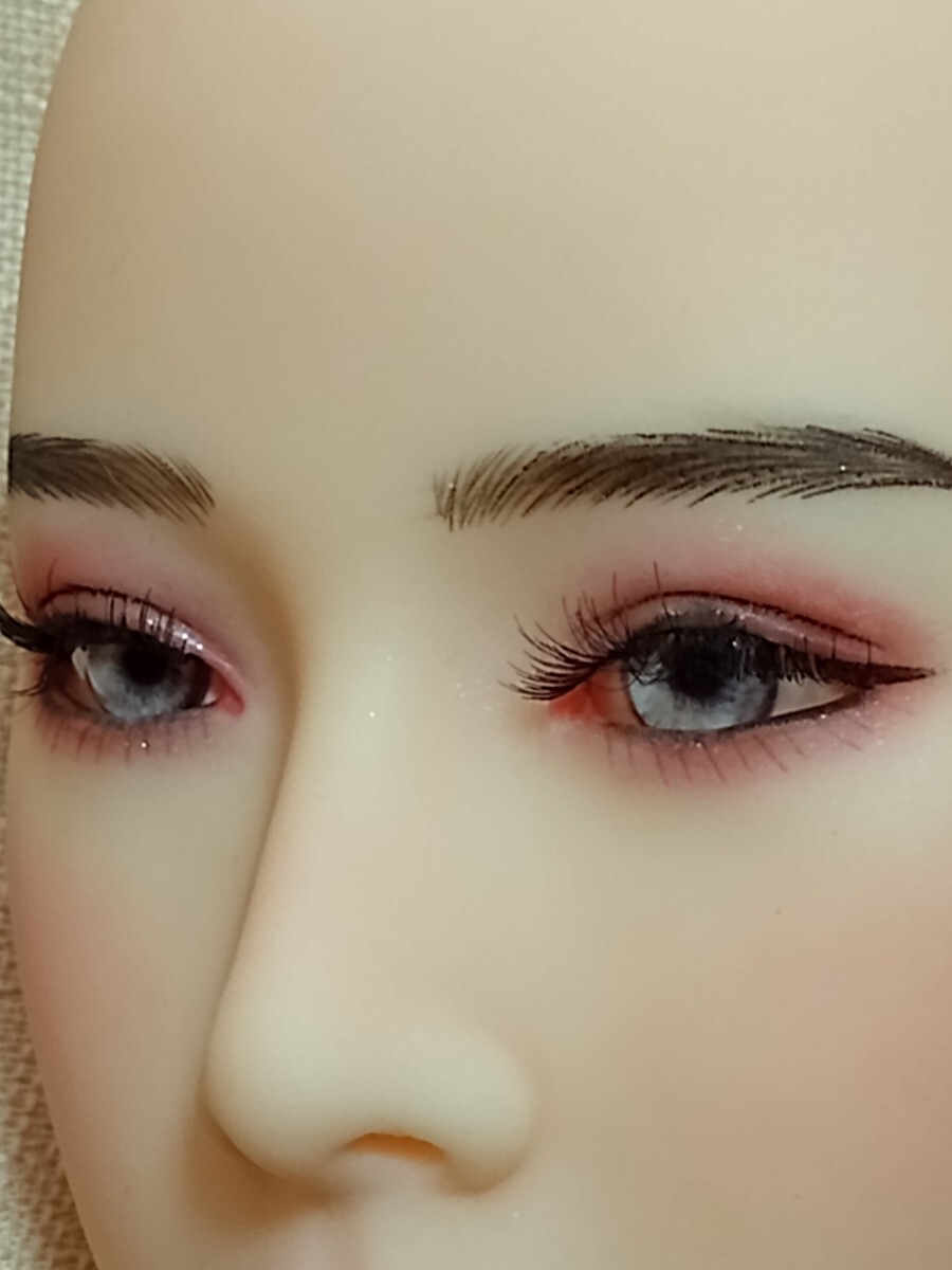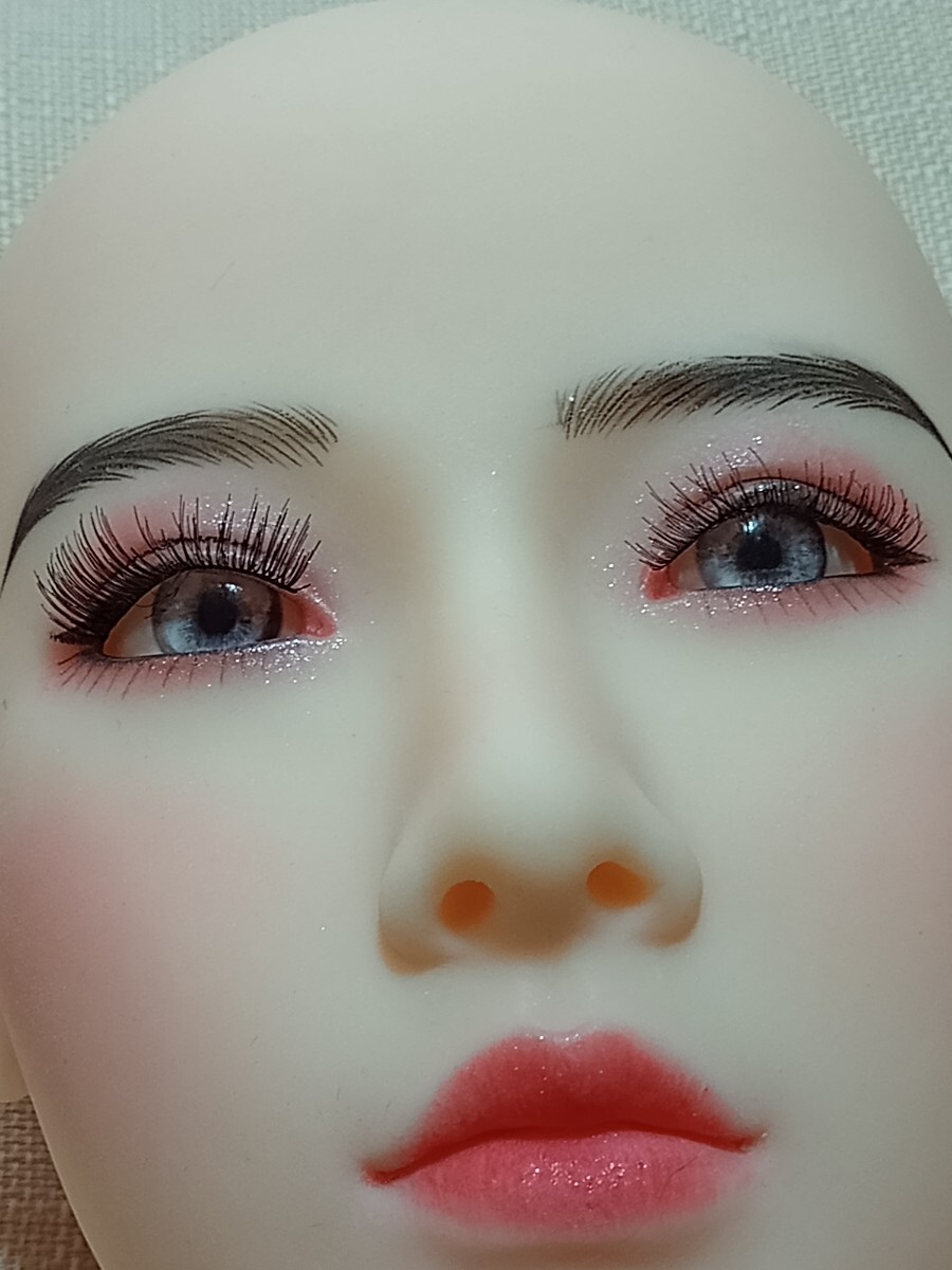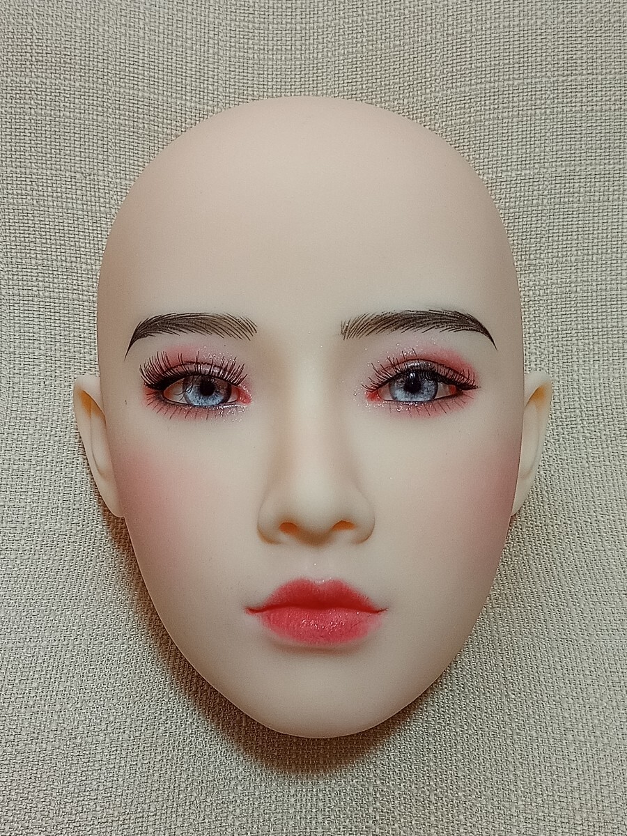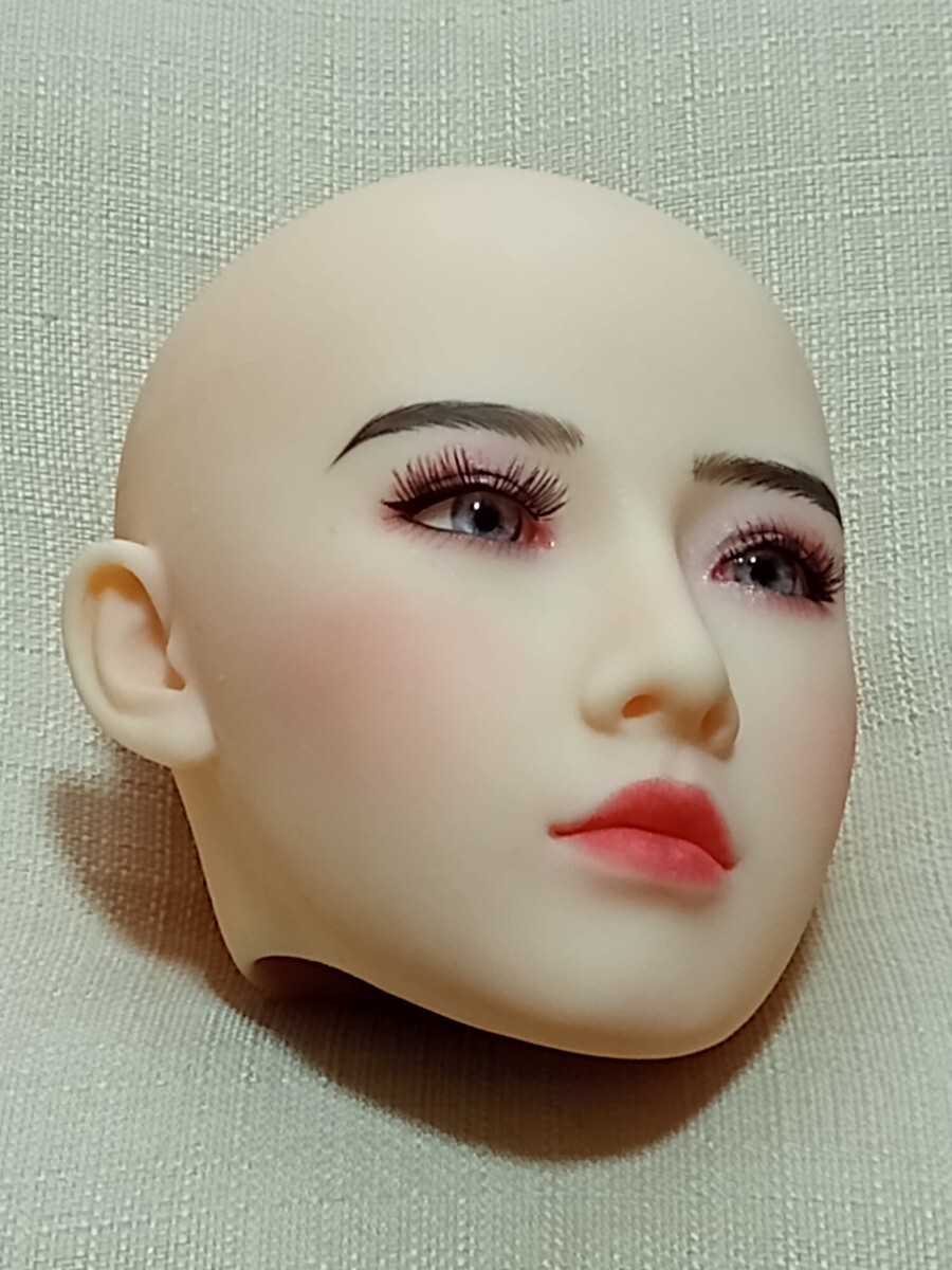 等身大サイズのリアルドールヘッドです。非常によく出来ていてTPE製により肌触りも素晴らしいです。瞳はグレーです。口は開きます。目の周りに赤いアイメイクが施されています。とても美人です。頭部サイズは約50cm、125㎝~140㎝ボディのリアルドールに最適です。首ボルトはM16が付いています。ブラウン系ウィッグが付属しています。
