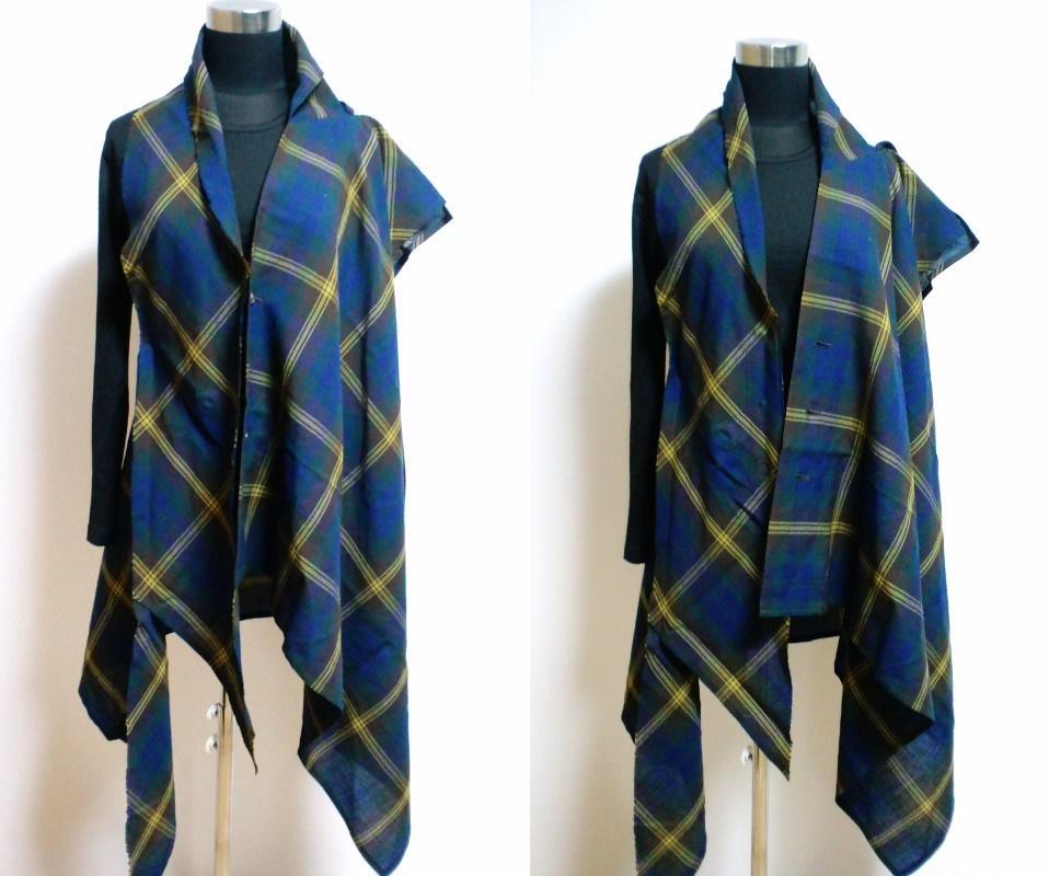 ご覧頂きありがとうございます。ワイズ/レッドレーベルの変形ドレス(委託品)になります。デザイン性が高くとても人気のあった商品で、前釦3個と内釦1個を留めて着用する一部裁ち切りの重ね着用の変形ドレスです。左右非対称でアシメトリー、釦を全開・3個だけ留めて・全部留めてと3通りに着用する事ができます。色は青チェック、素材はウール100%(縮絨)、サイズは2、肩幅計測不可、身幅43cm、丈(最長)105cm位です。変形デザインの為、採寸は参考程度とお考え下さい。因みにボディーは9号サイズを使用しております。3~4回着用で全体的には綺麗ですが、前合わせ部分から26cm外側に直径1mm程の小穴(3枚目画像の棒先)がございます。個人的には目立たないかと思いますが、前記の事・ユーズドとの事をご理解頂ける方のみご入札願います。ノークレーム、ノーリターンでお願い致します。発送はレターパックかヤマト運輸でお願い致します。ご連絡は2日以内、お支払いは3日以内でお願い致します。なお出品商品と無関係なご質問、画像転用、値引き交渉はご遠慮下さい。