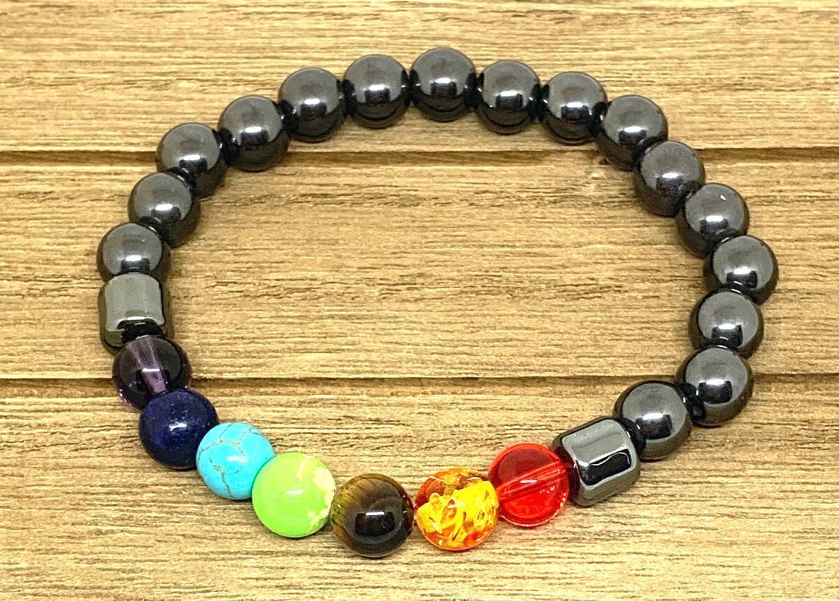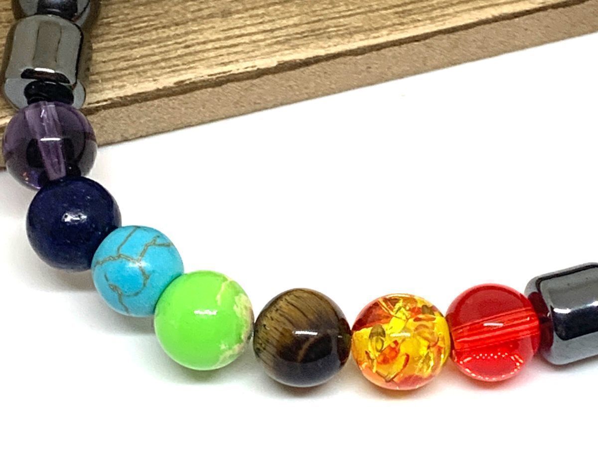 カラフルなヘマタイト磁気ブレスレットのご案内です。 タイガーアイやラピスラズリやターコイズなど7種のパワーストーンが虹を表現していて美しいです。磁気ヘマタイトは身に着ける人の血液にエネルギーを与えるとされています。 赤血球の働きを活性化し、全身への酸素供給量が高める事から、 運動能力を高める効果や肉体労働をされている方には特におすすめで持久力を高めると言われています。(個人の感想を含みます。薬事効果を保証するものではありません) コーティングはありますが、ヘマタイトは鉄分を含むため、汗や流水はお避け下さい。 汚れは乾いた柔らかい布で軽く落としてください。珠のサイズ約8ミリ。手首周囲17.5センチまでの方に。