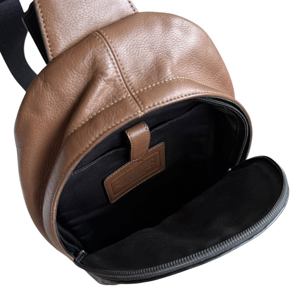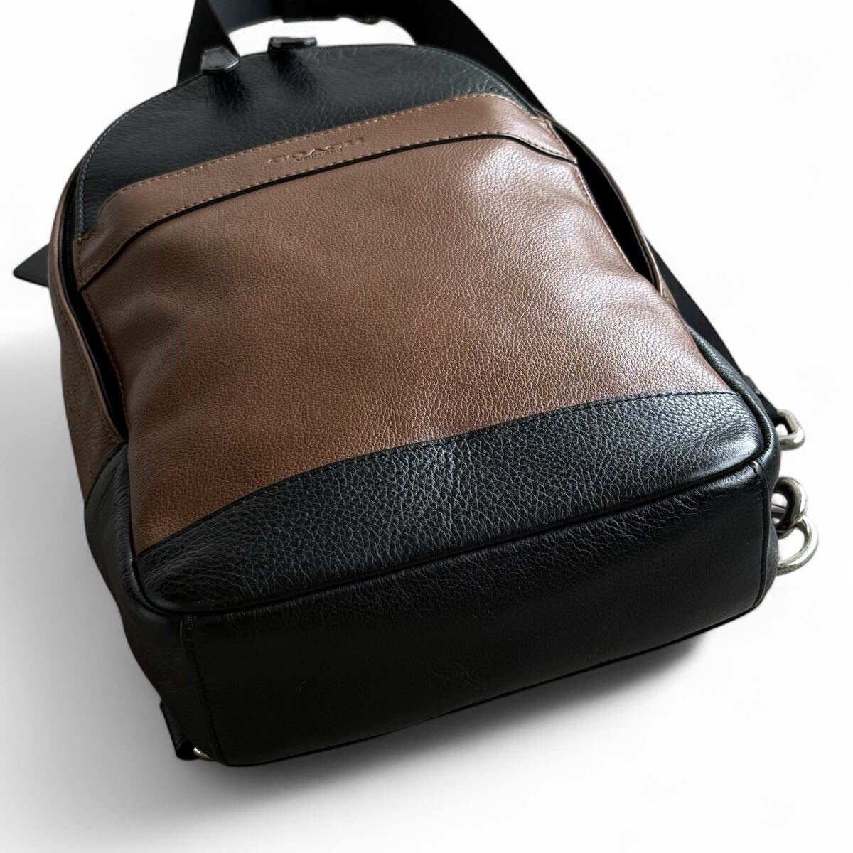 極美品●COACH コーチ メンズ ボディバッグ ショルダーバッグ 斜め掛け スムースレザー バイカラー ブラウン ブラック 黒 ビジネス 本革