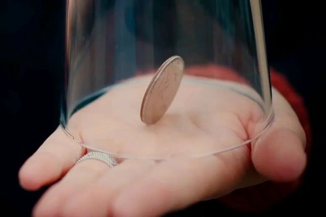 観客の手の上に乗せたコインの上にグラスを被せます。