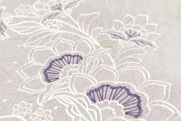お太鼓や胴部分には、白色、薄紫色、鉄紺色、銀糸で、更紗の丸文が刺繍されております。