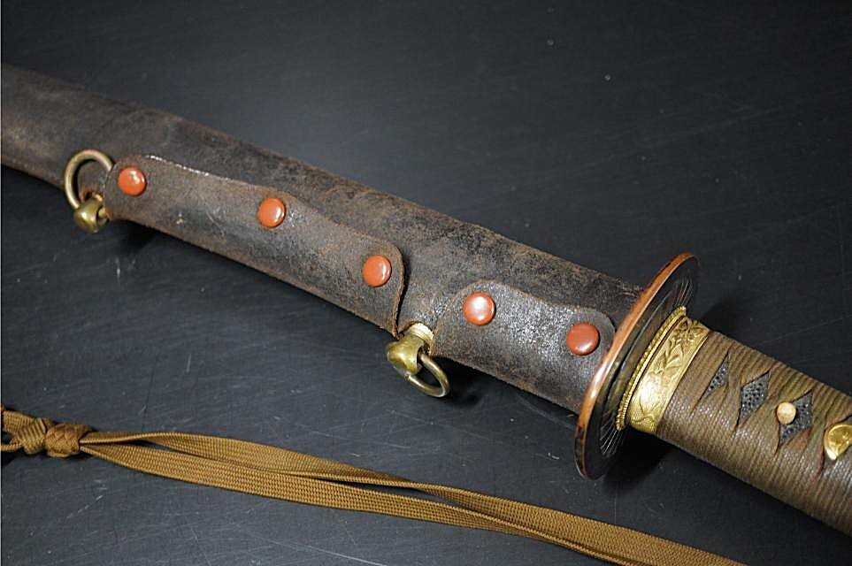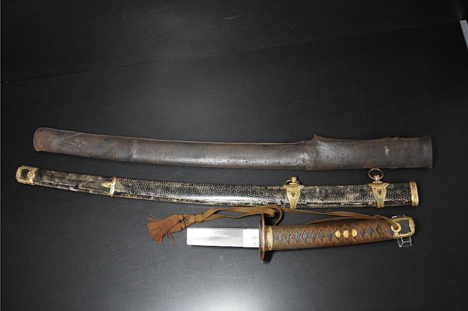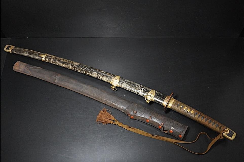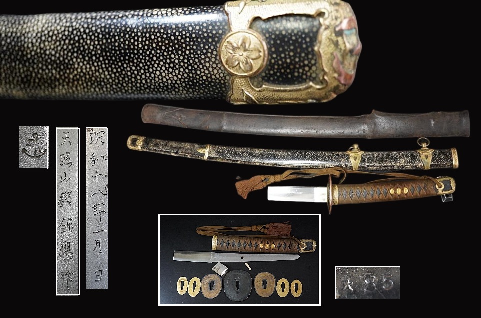 旧日本海軍 軍刀 太刀拵 (本身残欠9.8cm) 全長97cm [銘 錨 天照山鍛錬場作/裏銘 昭和十八年1月日] 鮫皮研出鞘 揃85刻印 革カバー付です。