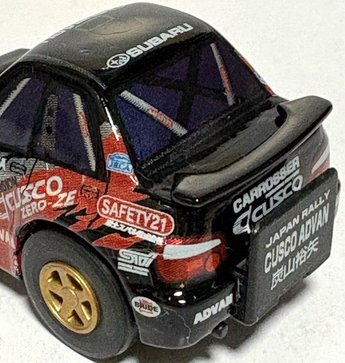 モデルは、ブラックにシルバー、レッドのクスコカラーのマシンで、ヘッドライト、テールランプ、インタークーラーのボンネットダクト、クスコブランドのSAFETY21の室内ロールケージ、CUSCO LSD、ADVAN A035、スバルSTI等のロゴ、細かくはエンブレム、ボンネットピンまで再現されています。