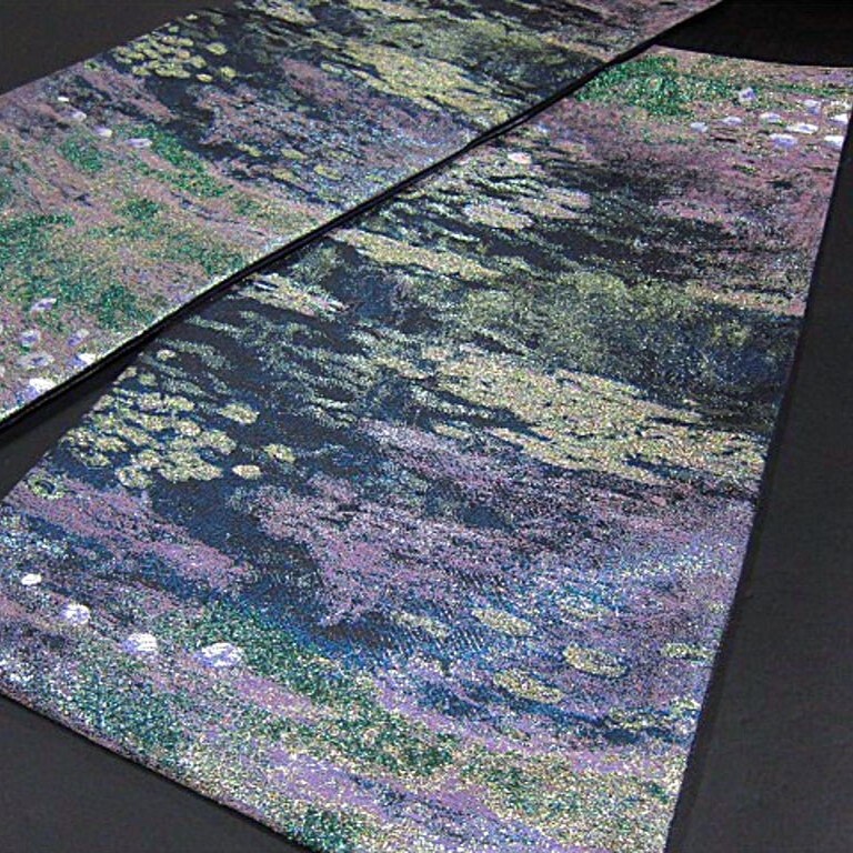 新品未仕立 西陣織六通柄袋帯です。こちらですが、名画、モネの睡蓮をモチーフに織り上げられた帯になります。エレガントに織りあがった逸品かと思います。クリエイティブなセンスあふれるひと品かと思います。パーティーなどにもいかがでしょうか。美しいグラデーションに織り上がっております。上品な大人のお洒落帯にぴったりの一品かと思います。
