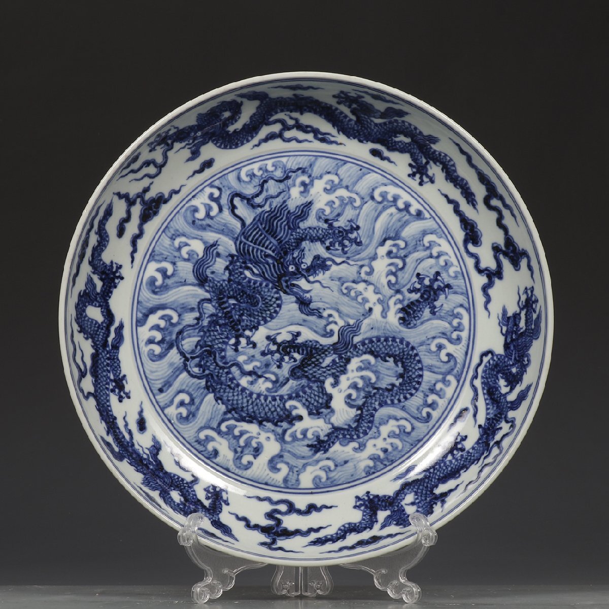 Product name: 【安】明時代 大明宣徳年製 青花海水龍紋盤 共箱 唐瓷 染付 古陶瓷 中国古美術 古董品 340