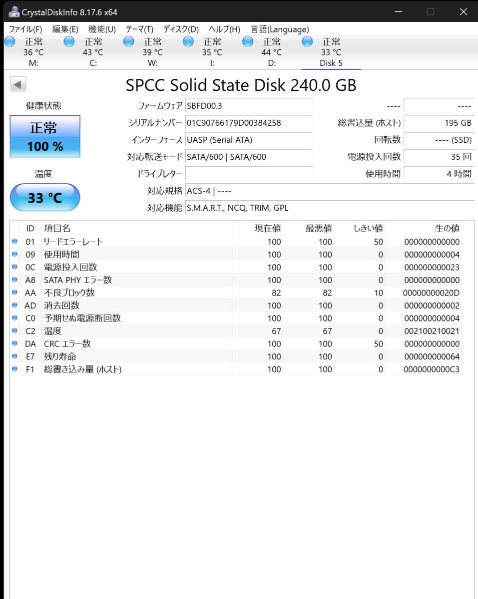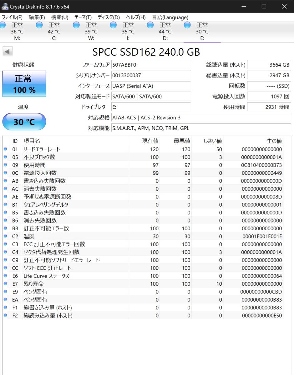 健康状態はクリスタルディスクインフォを確認して下さい。