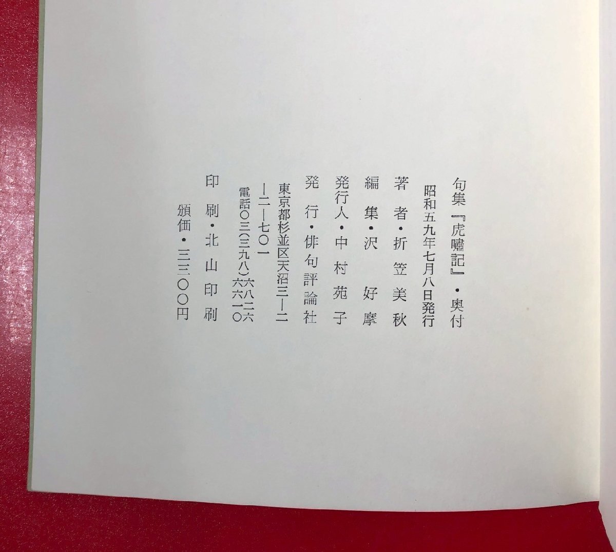 商品名 折笠美秋 句集 虎嘯記 奥付 昭和59年発行 俳句評論社 俳句集 本