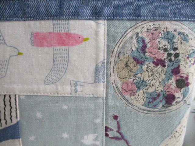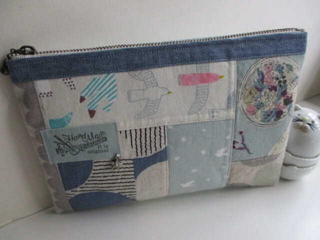 ハンドメイド * ちょっと大きめ 通帳ポーチ * 綿麻 等 いろいろ * パッチ :水色 青系:2 : ♪
