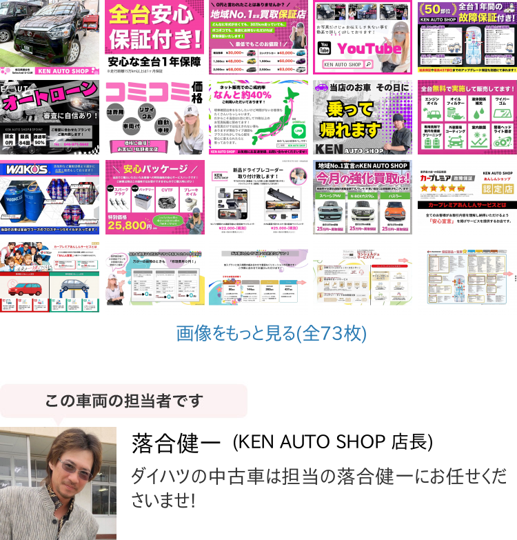 基本現状販売ではございますが、薄利多売とはいえ、全台50部位1年保証付帯(20年超え/15万km超えの場合は1か月/1000km)、内外装は磨きや徹底したルームクリーニング実施、当店で出来る範囲で加修や全台エンジンオイル/エレメント交換、液体類補充又は交換、当店で取り替えたほうがいいと思う部品は交換し、乗って帰れる状態まで仕上げてから販売しております。軽自動車はその日に乗って帰る事も出来ます!