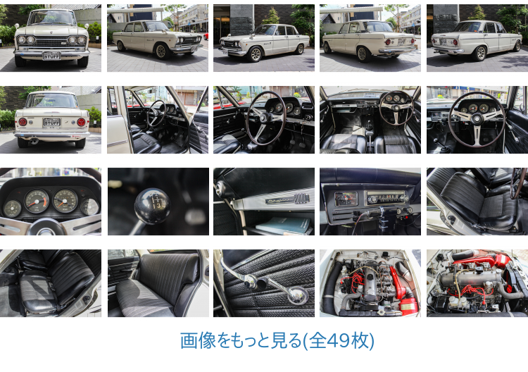 シングルナンバーで2オーナーの実走車両です。基本純正スタイルとなっており、ホイールはRSワタナベを着装。2代目スカイラインはボディーサイズがコンパクトになって登場致しました。それがG1エンジンを積んだスカイライン1500、のちにレースに出場するためにフロント部分を200mm延長してグロリアのG7エンジンを載せた2000GTを世に出します。これがS54スカイラインの起源です