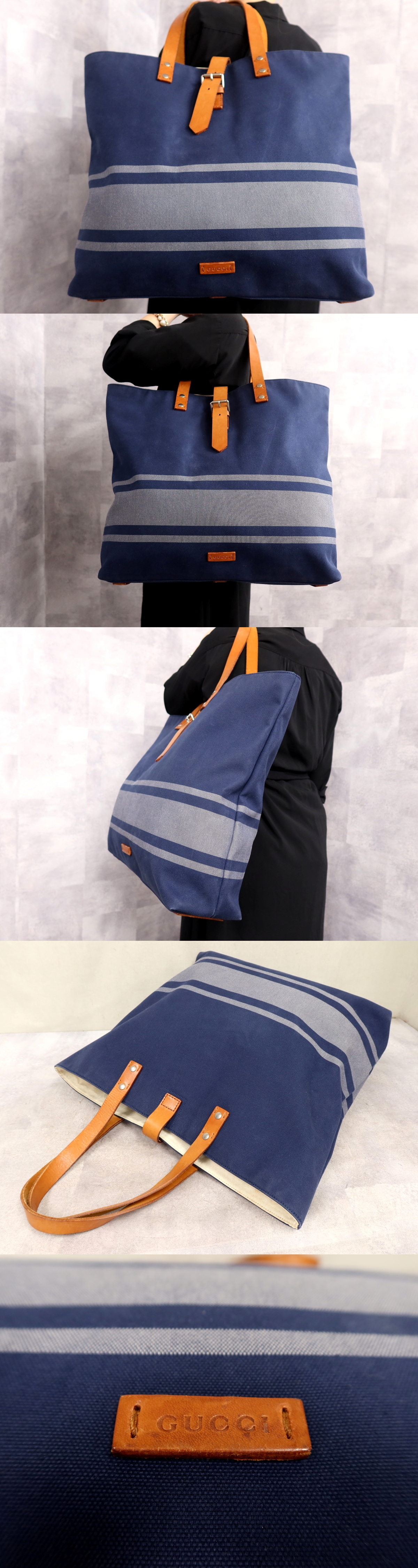 Store ●美品●GUCCI グッチ●メンズ●キャンバス カーフ レザー 本革●トート バッグ●ネイビー キャメル●SV金具●肩掛け●イタリア製●Js67157