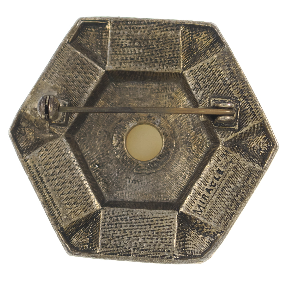 UK2439◆【MIRACLE】◆ 六角形 ブラウン系や朱色系マーブルストーン アザミの花模様 ミラクル ケルト イギリス ◆ ヴィンテージブローチ ◆