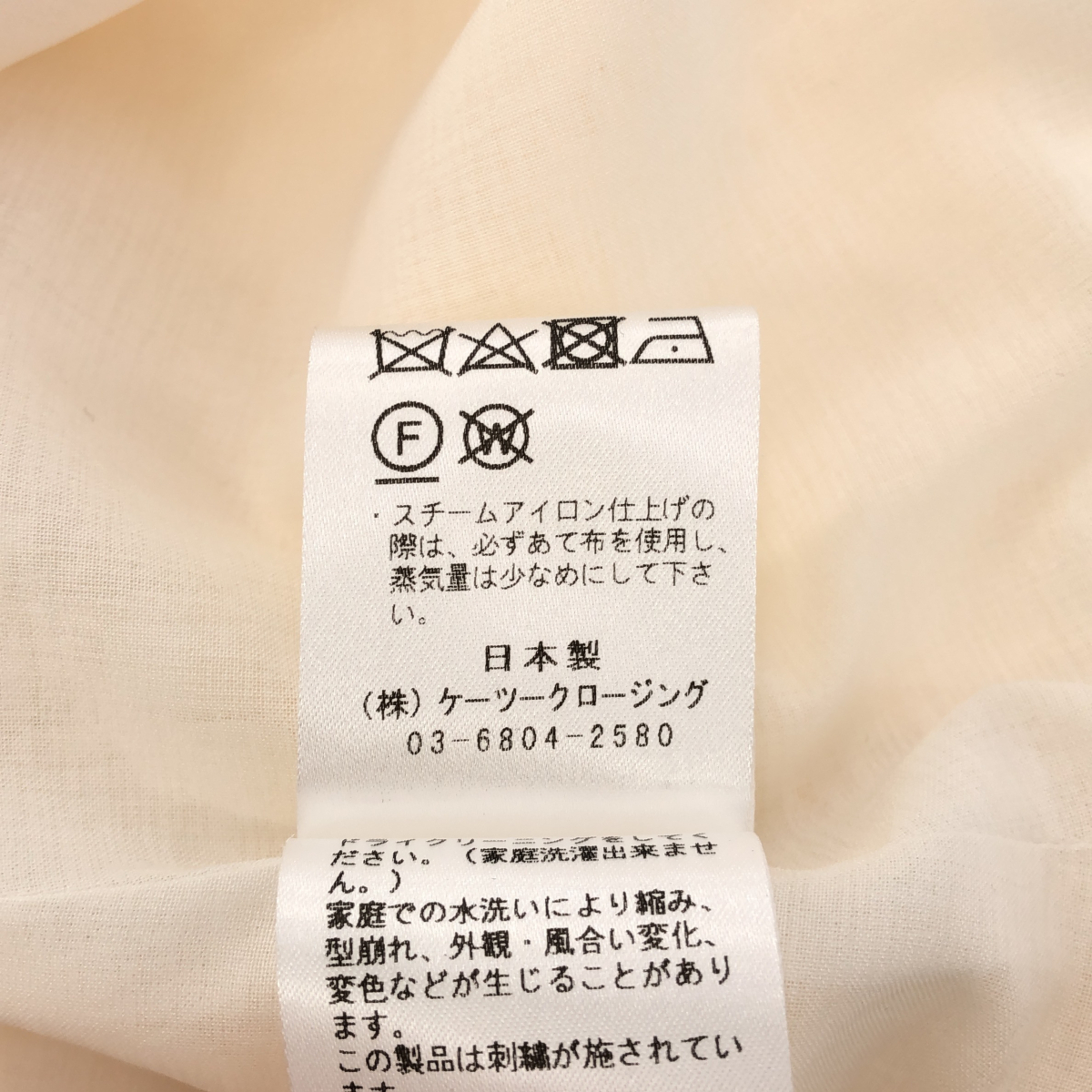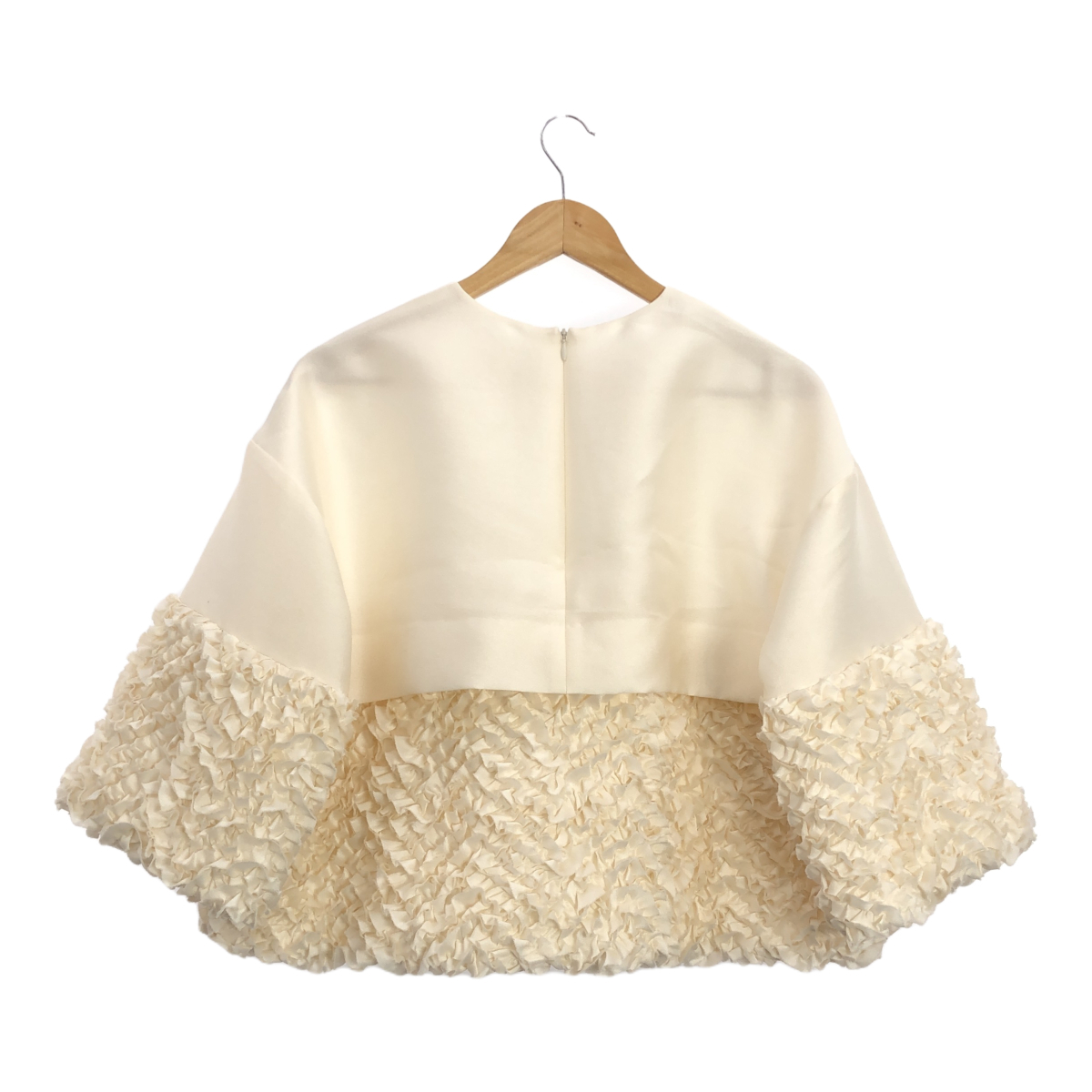 ふわふわなホイップをまとった様なショート丈フェミニンブラウス。繊細な加工を施しています。シルキーな光沢感、高密度で見た目以上の軽さがあり、シルエットをKEEPしてくれるハリ感のある上品な素材を使用しています。顔回りはすっきりとしたノーカラー、ゆとりを持たせた肩のラインと丸み、裾に向かってボリュームある女性らしいフォルムでニュアンス感のある表情に。*ホイップ刺繍の軽快さを表現する為にあえて断ち切り仕様の加工に。生地糸が出てきたら引っ張らずハサミ等でカットしてください。サイズ38の表記あり。※公式HPより引用。ABランク。クリーニング済みのお品になります。大きな問題のない、比較的綺麗なお品です。