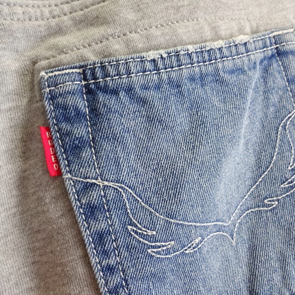 ◆フロントはクラッシュ加工されたライトブルーデニム・バックはグレーのスウェットの切り替えになったテーパードパンツです。