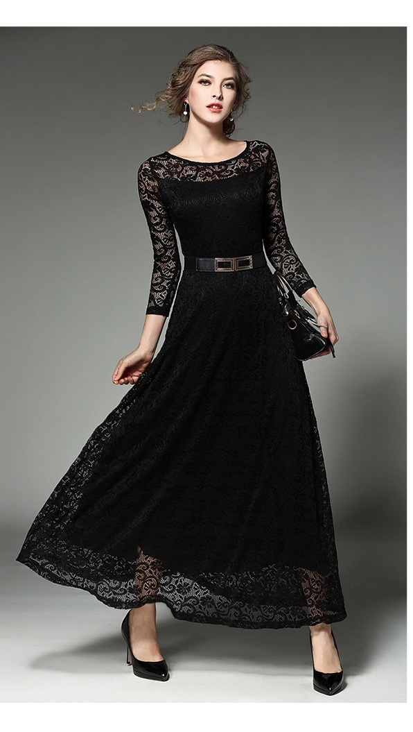Product name: 在庫一掃セール!激安!ブラック L パーティー 二次会 結婚式 披露宴 美人スタイル ベルト付き 七分袖 花柄総レースドレス