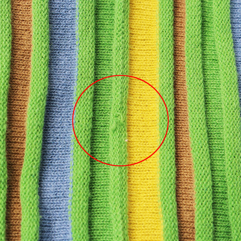 フロント上部にほつれ、5mm程の汚れが見受けられます。また、ウエストゴムにねじれがございます。