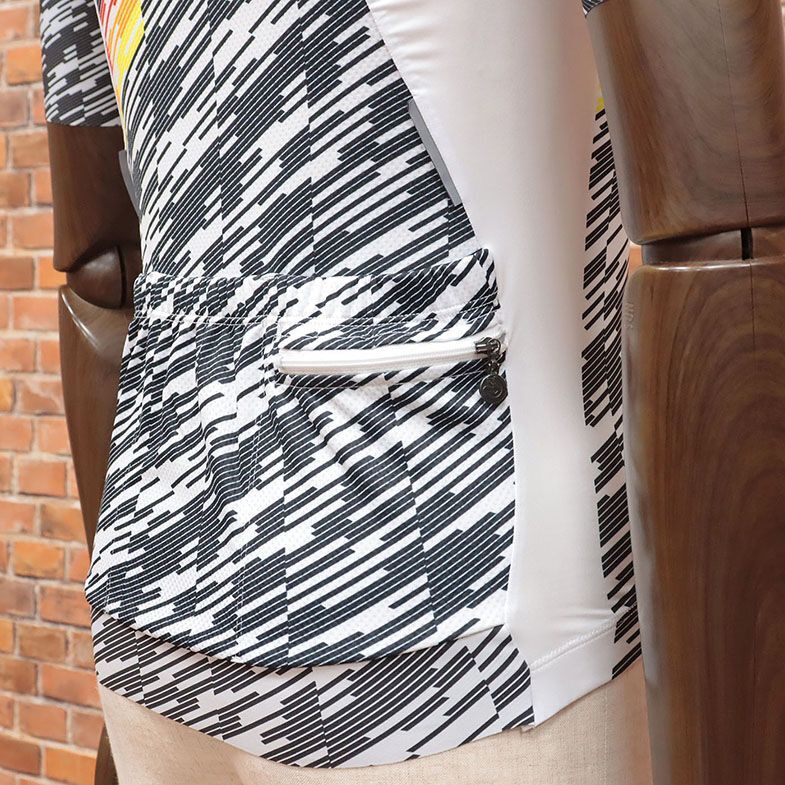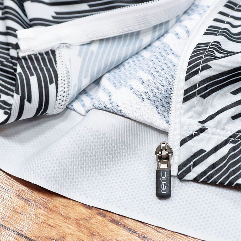 前身頃と袖は透湿性・UVカット・2WAYストレッチを併せ持ったMITI社ASTERIA、後身頃は吸水速乾・ストレッチを兼ね備えたレリックオリジナル素材マグヌスメッシュを組み合わせて作られたサイクルジャージ。幾何学調のスラッシュデザインが個性をアピールしてくれるアイテムです。背面には走りながらでも取り出しが容易なポケットが配置されており、荷物を最小限にすることで長時間ライドによる体への負担軽減を考慮された嬉しい作りとなっています。