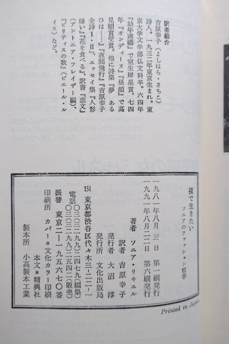 Product name: 裸で生きたい ソニアのファッション哲学 (文化出版局) ソニア・リキエル、吉原幸子訳