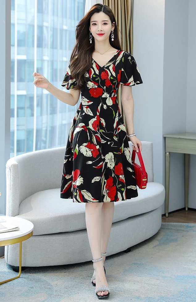 Product name: 在庫一掃セール!激安!ブラック M 通勤 パーティー 上品感Vネック シフォン花柄ワンピース