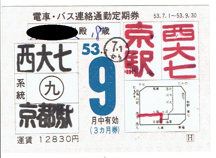 《定期乗車券》電車・バス連絡 京都市交通局 昭和53年