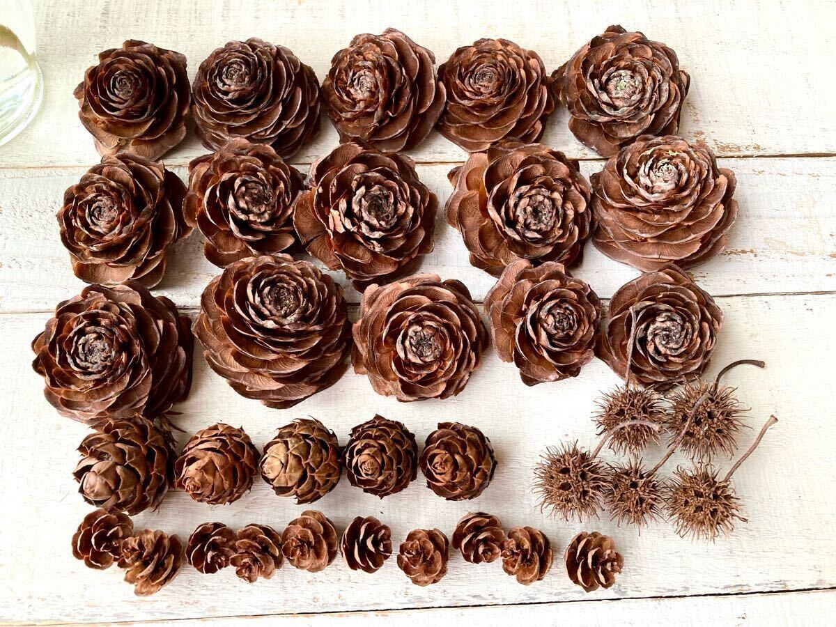 Product name: 天然素材 ■ ヒマラヤスギ シダーローズ15個 ツガの実10個 コウヨウザン5個 モミジバフウ5個 4種類セット松ぼっくり リース材料