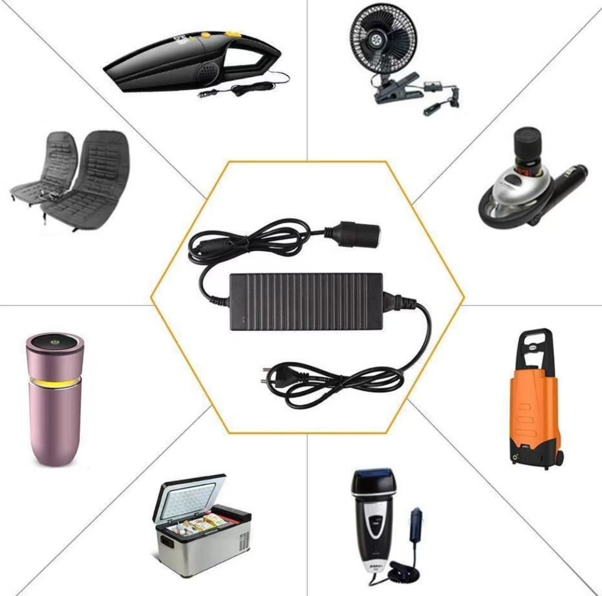 *車載用冷蔵庫/車載の掃除機/車載の空気ポンプ/車載のやかん/車載のオーディオなどの12V電化製品(120Wまで)を100Vの家庭用コンセントから電源を取る変換アダプターになります。