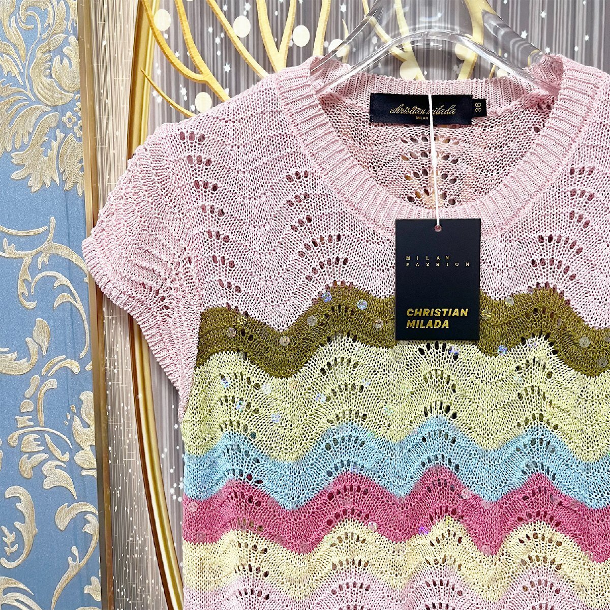 Product name: 定価3万★christian milada・ミラノ発・半袖 Tシャツ★ウール混 薄手 通気 ニット 透かし編み キラキラ カラフル レディース 夏 S/34サイズ