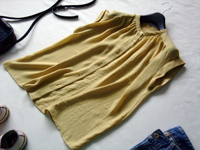 訳あり★大人素敵★人気★涼し気軽量素材★フレンチ袖ギャザーふんわりブラウス★Mからしマスタード背中切り替え★