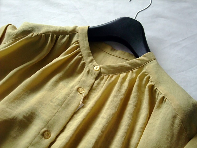 訳あり★大人素敵★人気★涼し気軽量素材★バンドカラーフレンチ袖ギャザーふんわりブラウス★Mからしマスタード背中切り替え