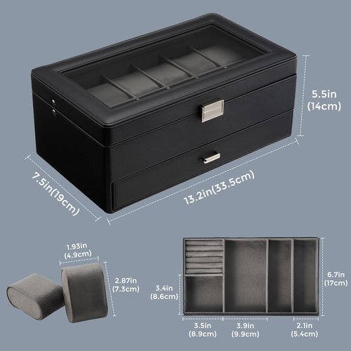 寸法:13.07x7.48x5.31インチ。文字盤サイズ最大48mmまでのあらゆるタイプの時計を収納できる12個のスロット。