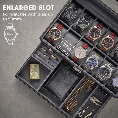 多機能コンパートメント:最大12個の時計、ストラップ、カフスボタン、ブレスレット、指輪、ペン、ネックレスなどのジュエリーをまとめて収納でき、湿気、振動、摩擦、紛失から守ります。