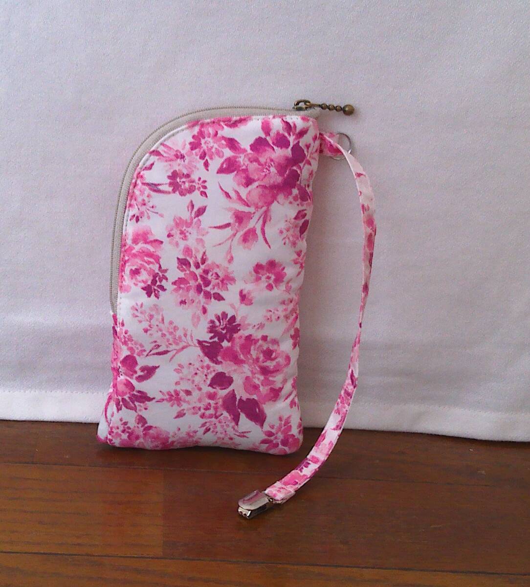 スマホケース・ファスナー★白地ピンクパープル花葉っぱ
