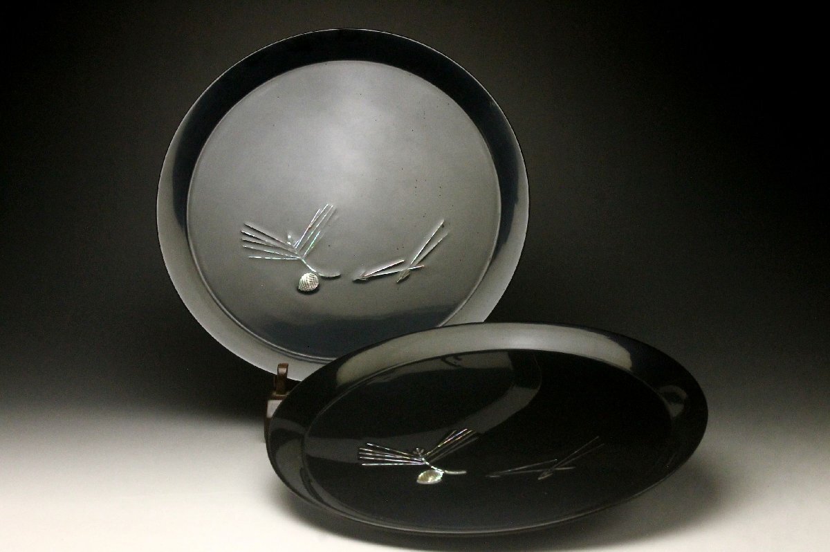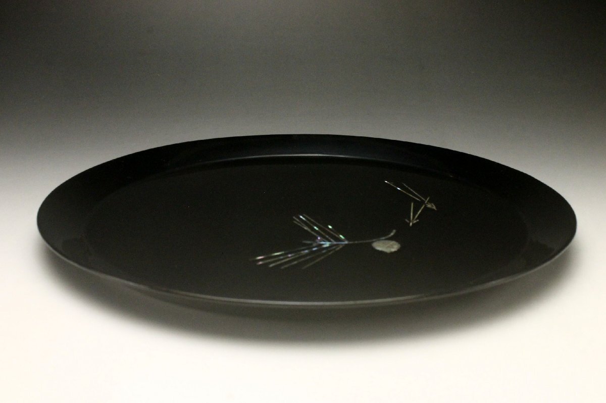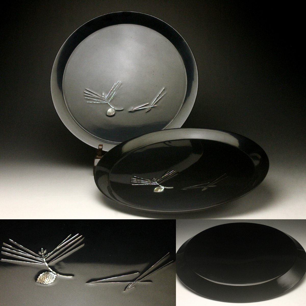 【余韻】 茶道具 天然木製 漆塗 真塗 螺鈿細工 松文 丸盆 2点★菓子盆 径:24cm<同梱可>
