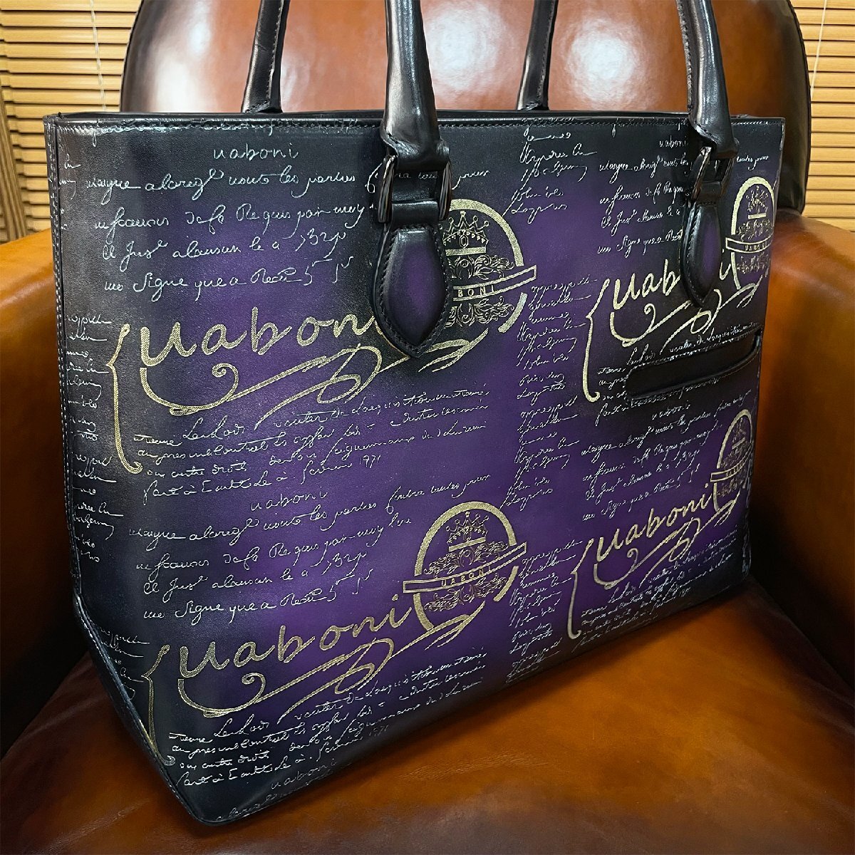 手触り感触が良くアンティーク風なトートバッグと仕上がりました。角の部分は丸みを帯びた設計になっており、全体的にカリグラフィーとゴールデン/シルバーパティーヌがデザインされております。色艶、柔かさに優れていて高級感溢れる逸品となります。