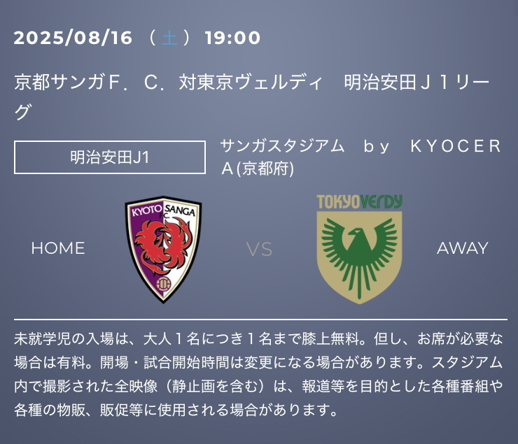 迅速対応★8/16(土) 京都サンガFC 対 東京ヴェルディ【南サイドホーム上層自由席】QRチケット 1枚 ②