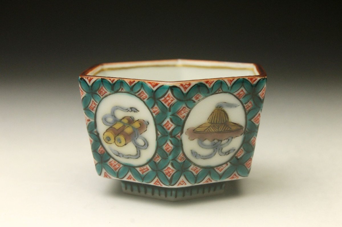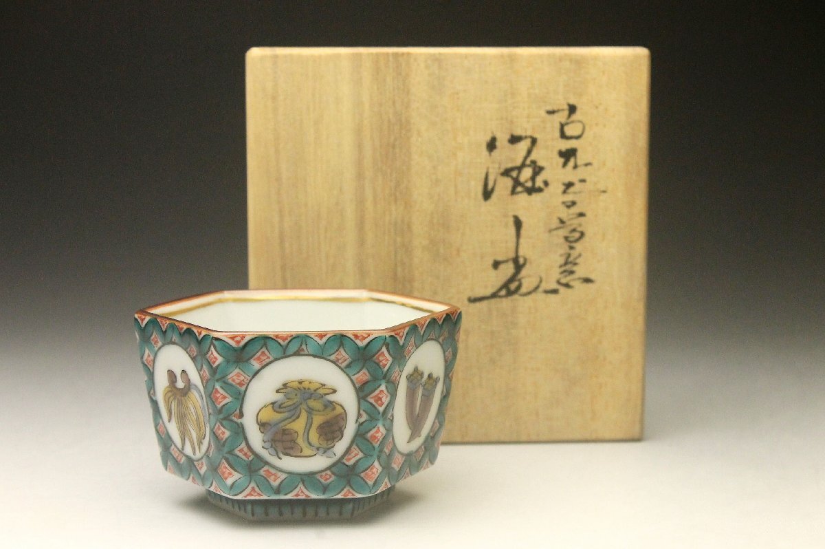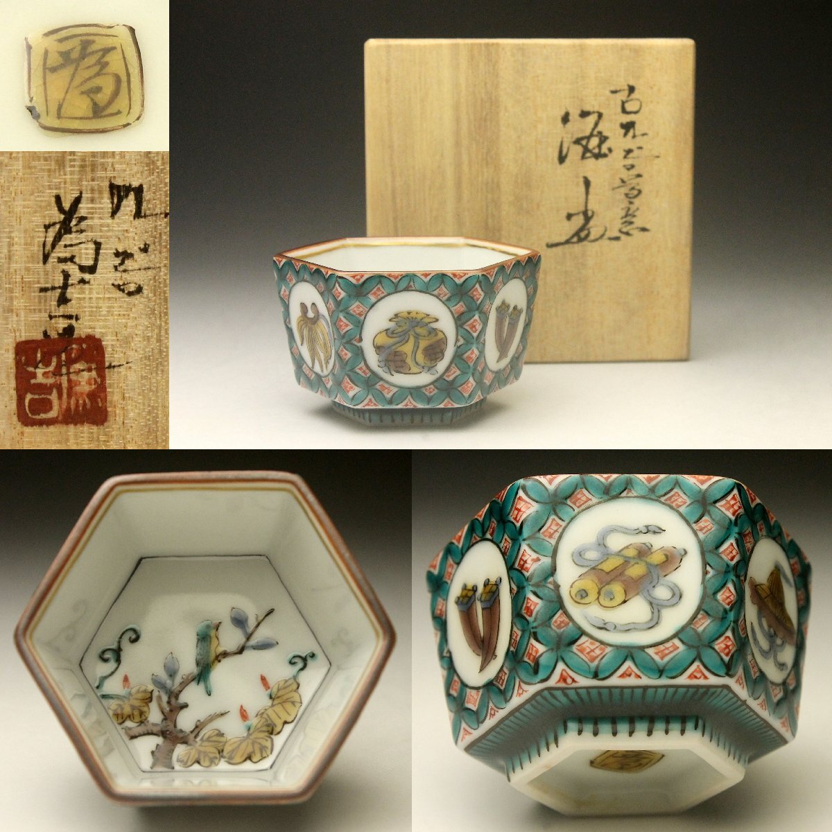 Product name: 【余韻】 九谷焼 三代為吉 三ッ井詠一 古九谷写意 六角盃★ぐい呑み 共箱 無傷美品<同梱可>