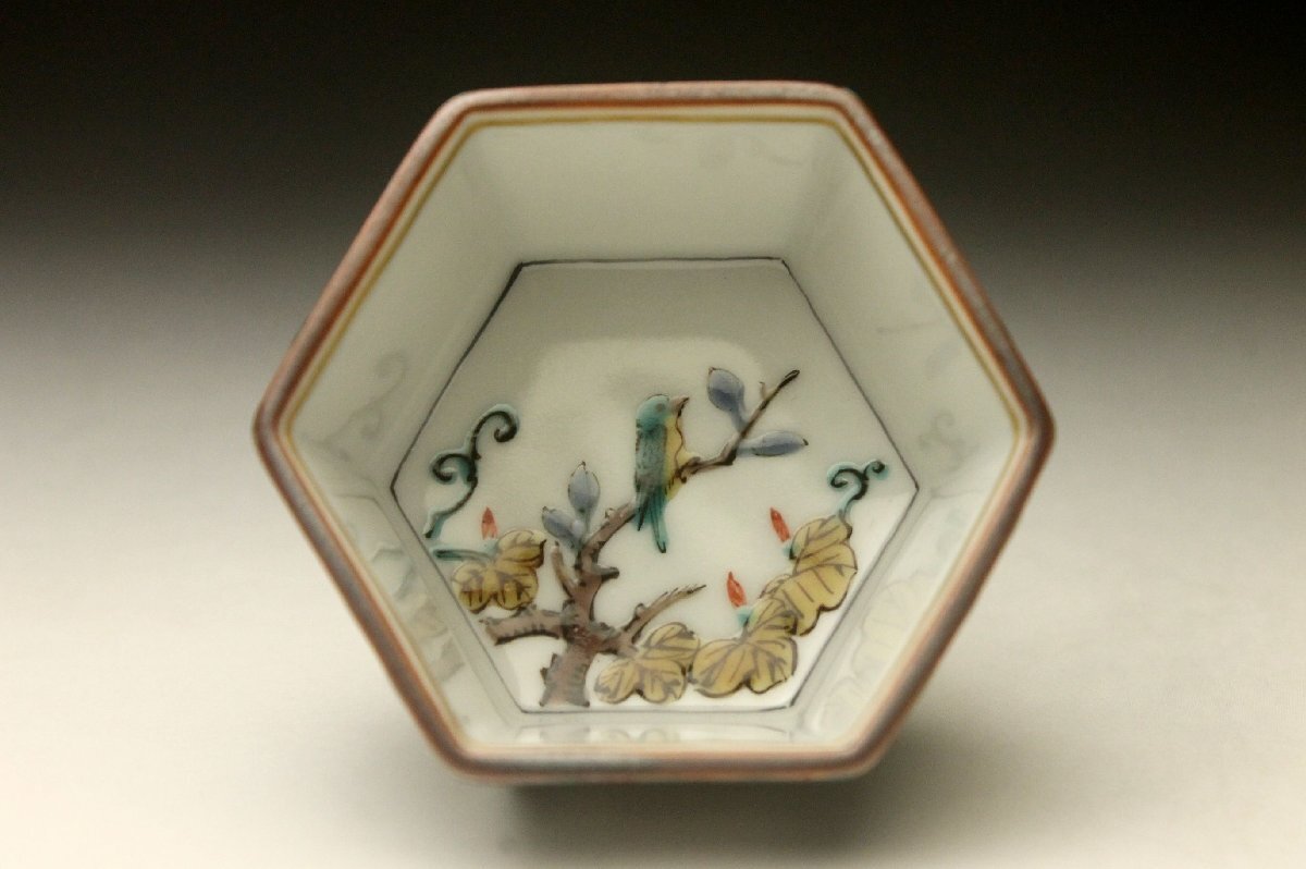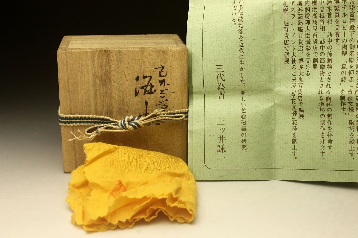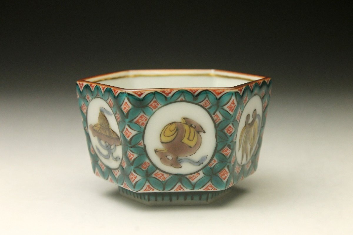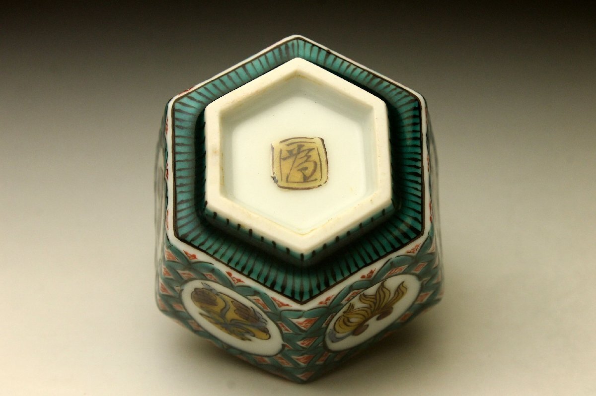 Product name: 【余韻】 九谷焼 三代為吉 三ッ井詠一 古九谷写意 六角盃★ぐい呑み 共箱 無傷美品<同梱可>