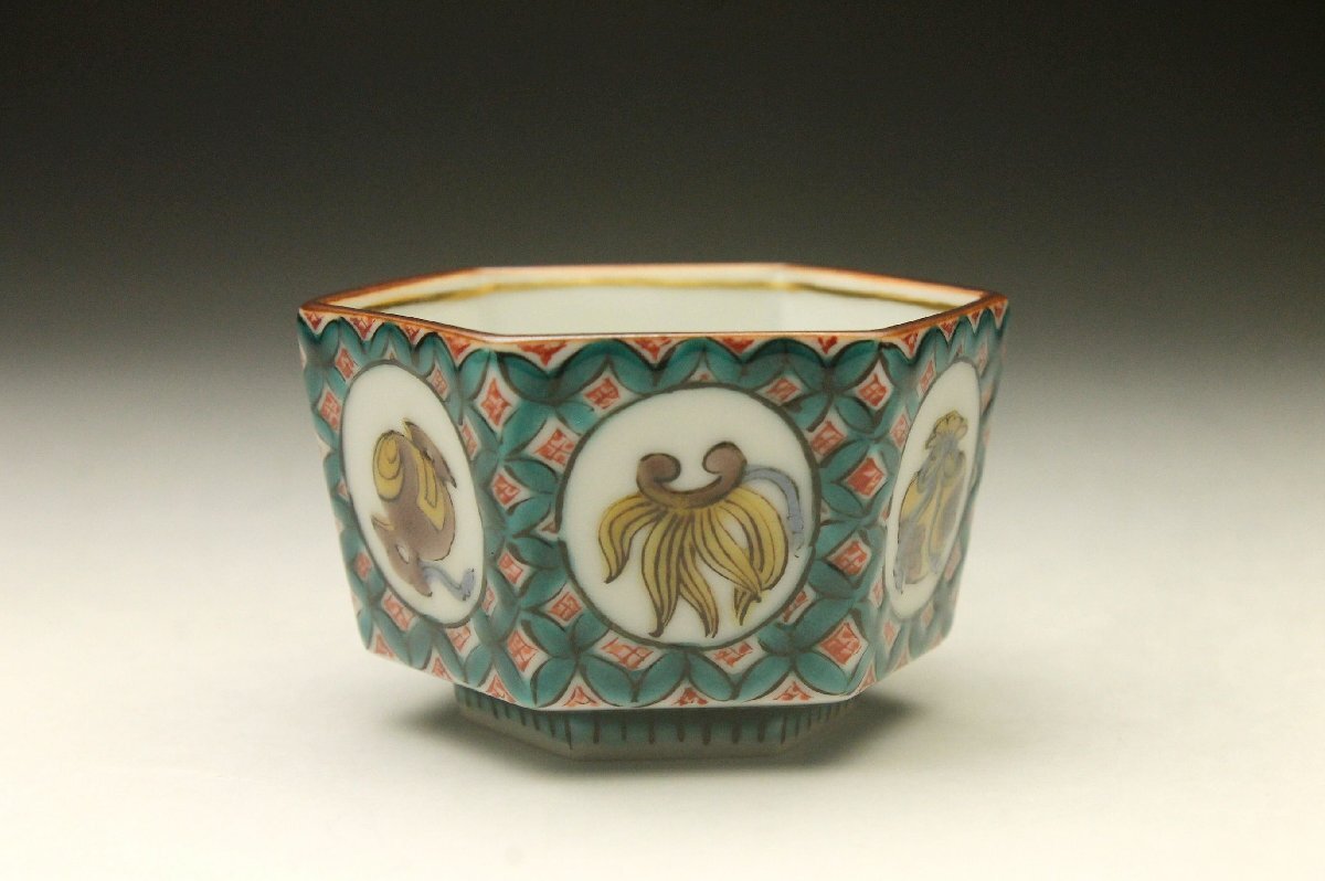 【余韻】 九谷焼 三代為吉 三ッ井詠一 古九谷写意 六角盃★ぐい呑み 共箱 無傷美品<同梱可>